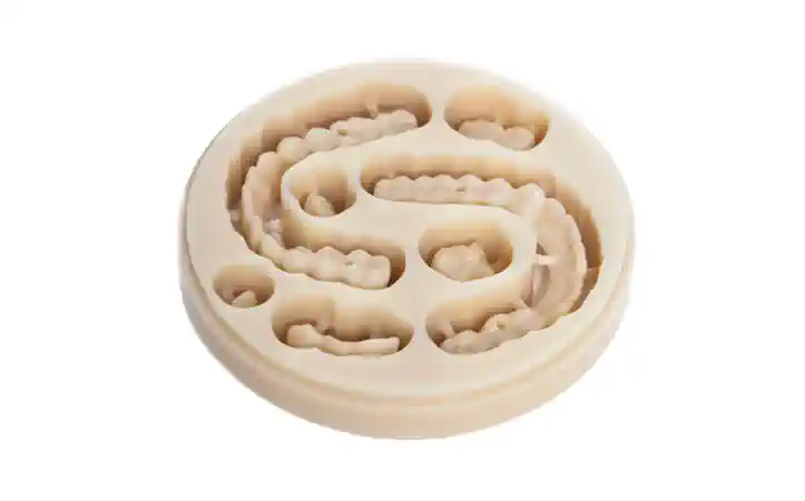 Тимчасова коронка чи міст повинні не лише гармоніювати з зубним рядом, а й забезпечувати пацієнтові комфорт у повсякденному житті. Для досягнення природного вигляду варто використовувати мультишарові PMMA-диски, де колір поступово змінюється від шийки до ріжучого краю, імітуючи природну будову зуба. Такий ефект дозволяє створювати конструкції, що не вибиваються із загальної картини посмішки, навіть якщо йдеться лише про тимчасове рішення. Додатково оптичні властивості можна підсилити завдяки світлопроникним чи флуоресцентним варіантам дисків, які максимально точно відтворюють характеристики натуральної емалі.