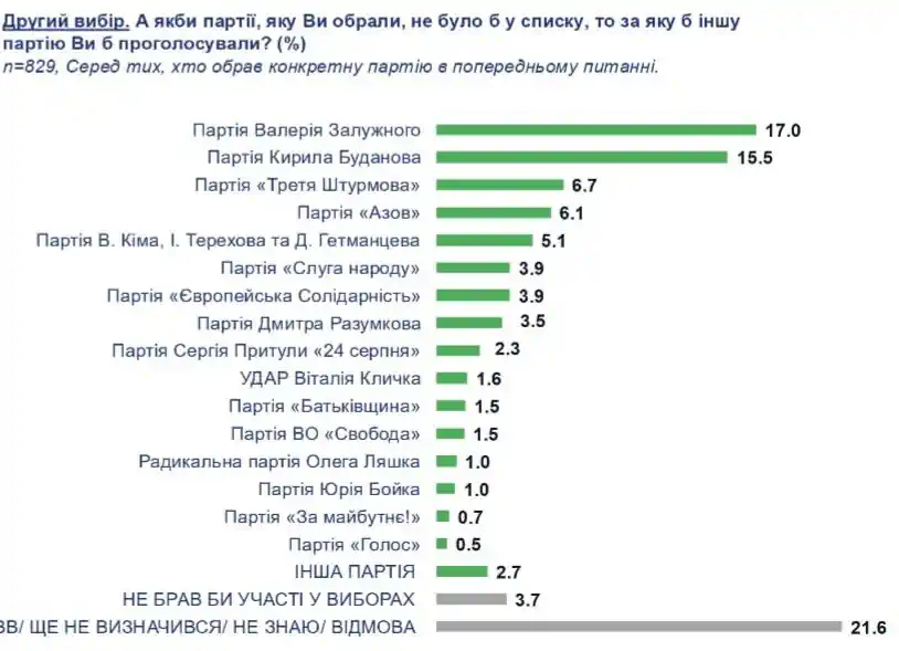 Якби вибори відбулися найближчої неділі, то найбільшу підтримку отримала б партія Валерія Залужного – її готові відтримати 21% опитаних, які визначилися і обов'язково підуть на вибори.